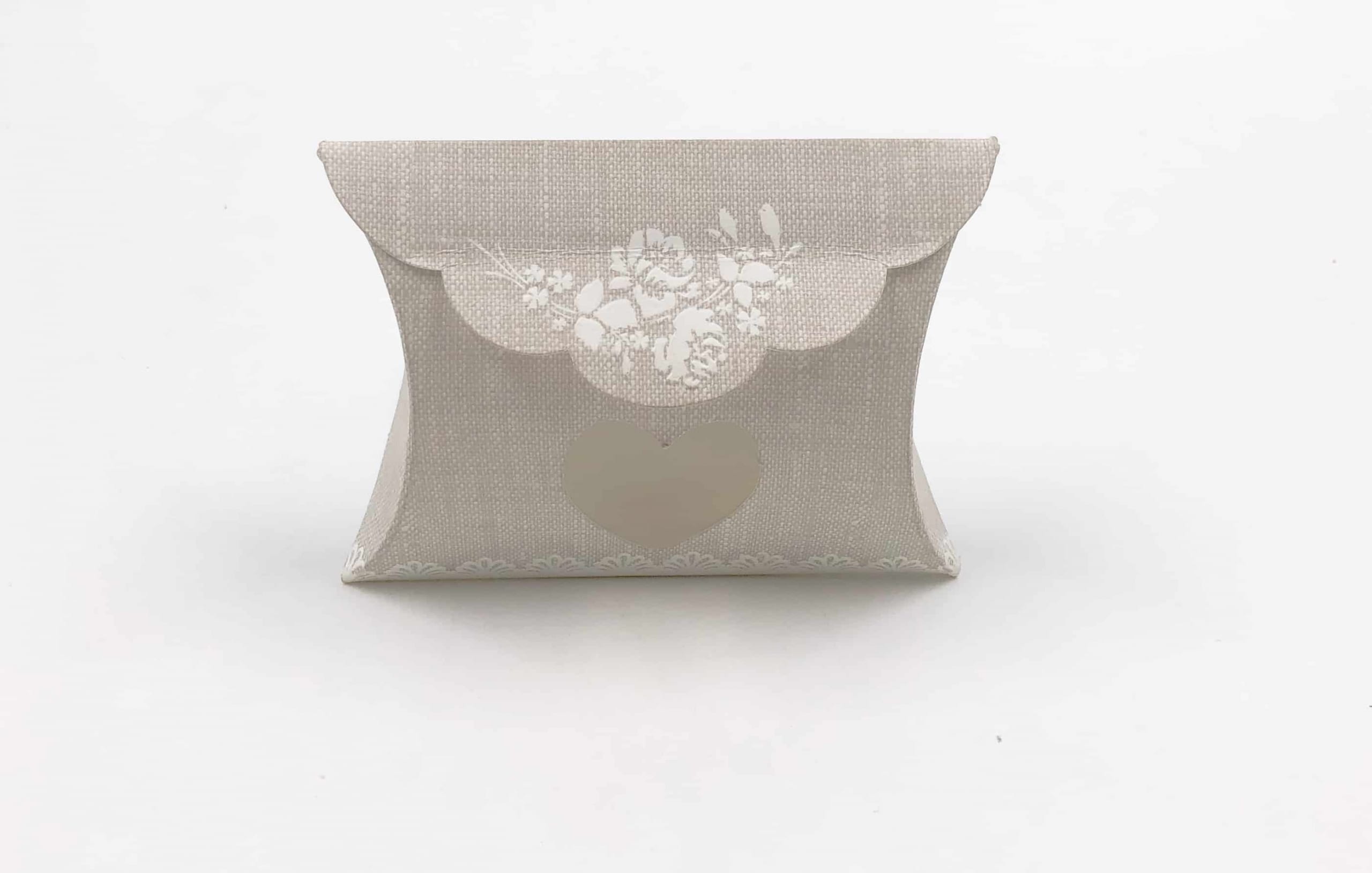 אריזה מעוצבת בצורת כרית בצבע אפור עם דוגמת שושנים בצבע לבן עם חלון שקוף בצורת לב.
