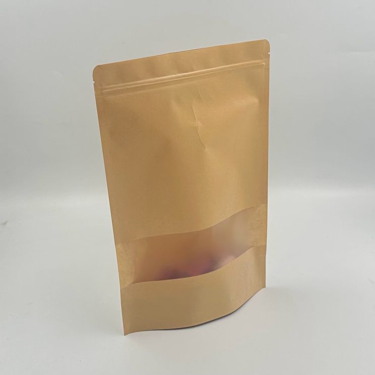 שקית נייר רב שכבתי בצבע חום טבעי עם פס שקוף, למינציה פנימית וסגירת פסגור.