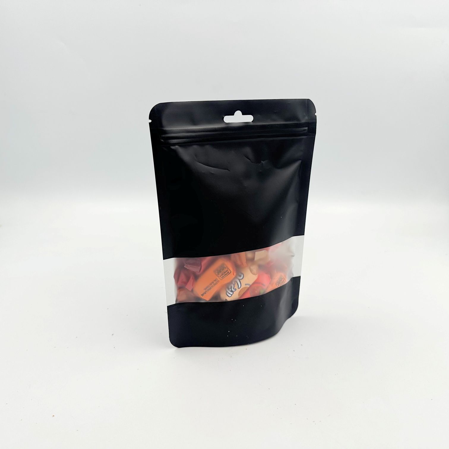 שקית נייר רב שכבתי בצבע שחור עם פס שקוף, למינציה פנימית וסגירת פסגור.